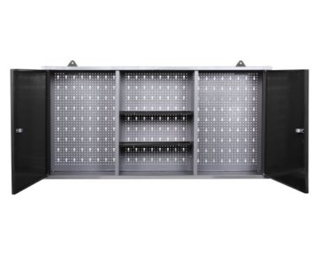 - 2x Metall – Werkstattschrank, 2 – türig, abschließbar, mit Eurolochwand zum Anhängen von Werkzeugen, im offenen Mittelteil höhenverstellbare Ablagen, je 120 (B) x 60 (H) x 19 (T) cm